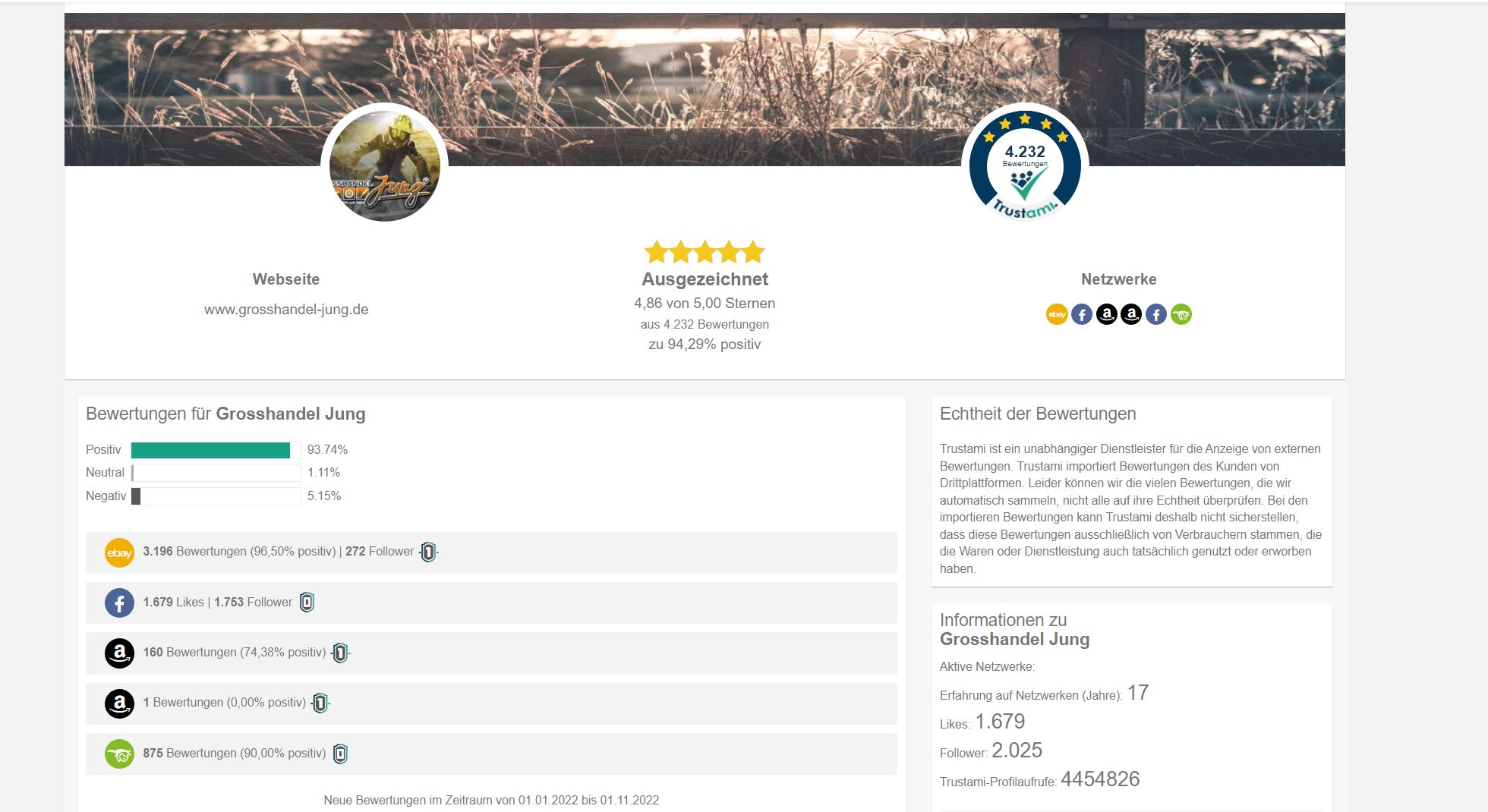 So aktuell von eben, nun sehen wir 17 Jahre mit den Shops und Netzwerken, über 4 Millionen Aufrufe von unserem Profil ! Wenn wir so unbekannt und unerwünscht währen, glaubt Ihr im ernst das wir dann ( seit es diese Trust Seite gibt) über 4000 Bewertungen mit 4,86 von 5 Sternen nicht durch Lieferungen und ein bissel Service auch erwirtschaftet hätten? Und dieses Profil ist nur 1 einziger Shop ! Wie Ihr wisst haben wir einige Onlineshops.