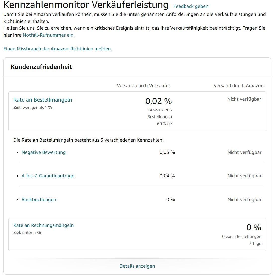 Verkaufe erstmal bei Amazon selbst und dann Reden wir weiter. Jeder der Amazon kennt, kennt die spielchen die es bei Amazon gibt. Händler die bei Amazon verkaufen wissen sofort von was ich Rede. Wir haben eigentlich auf die Bewertungen geantwortet. Bei Amazon gibts mehrere Ansichten der Verkäuferleistung. Hier ist mal ein Bild von einem Marktplatz auf AMA von uns von eben, da siehst du die Prozente im Bezug zu den erfolgreich Abgewickelten Bestellungen der letzten 60 Tage und das daraus resultierende Feedback vom Kunden.